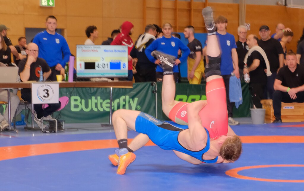Die Halle war gut gefüllt, die Stimmung von Beginn an elektrisierend. Den Auftakt machte Emirhan Uzungüney im griechisch-römischen Stil bis 57 kg. Nach kurzem Abtasten übernahm er die Kontrolle, punktete immer wieder und gewann souverän mit 15:2 nach Punkten. Ein starker Start. Schwergewichtler Gino Weiß musste sich anschließend einem sehr dominanten Maksym Piddubnyi geschlagen geben. Die Gäste verkürzten, Arheilgen blieb jedoch ruhig.
